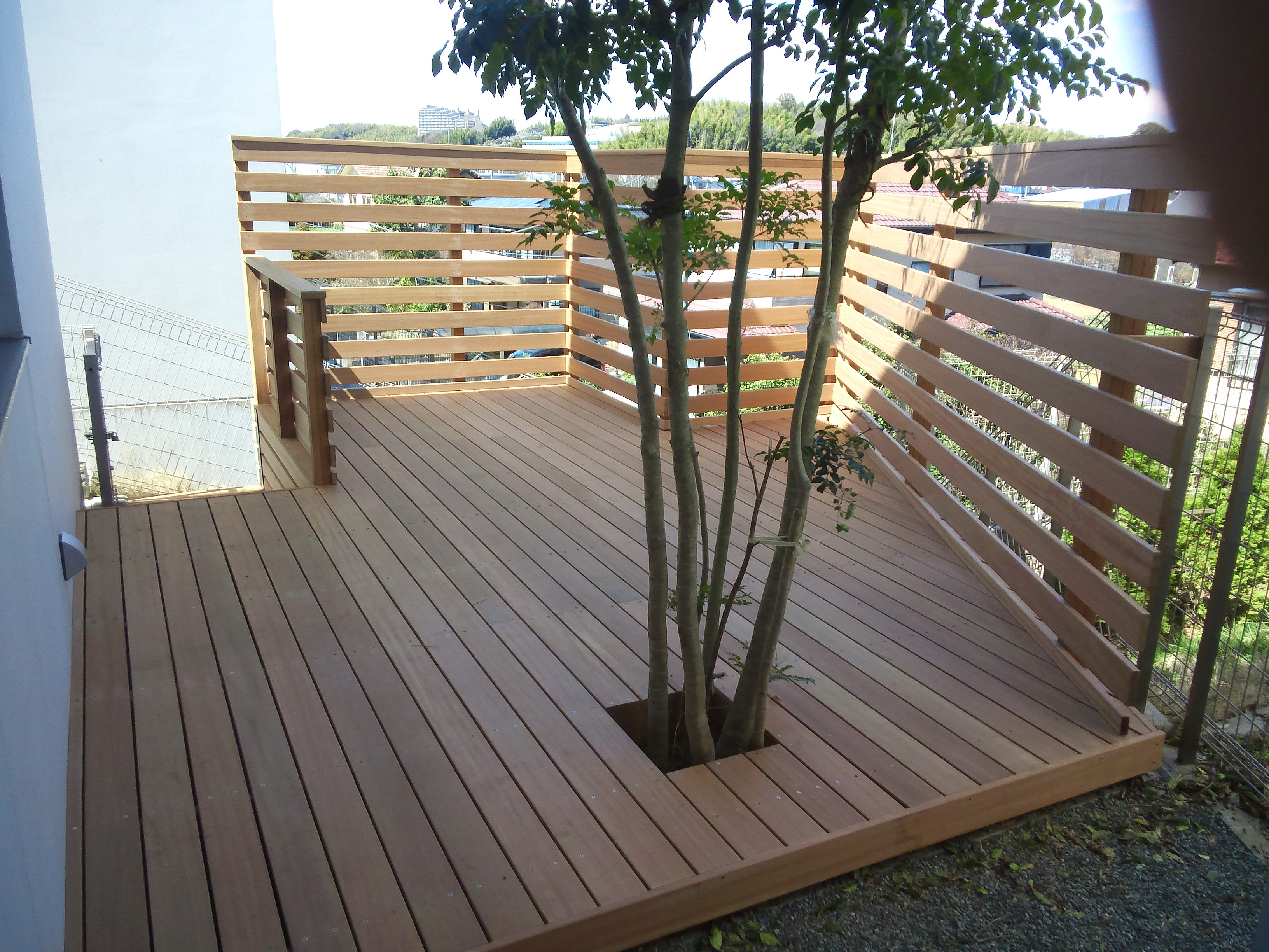 | ウッドデッキの材質は木製もしくはそれに準ずる材質の物。ウッドデッキに使われる木材は、設置される環境上、 高耐久の木材を使う必要がある。住宅用には加工しやすくDIYにむいている、ウェスタンレッドシダーが多く使われ、 耐久性お重視する場合には熱帯雨林産のハードウッドであるウリンやイペ等が使われることが多いです。 また樹脂と木粉を混合した木樹脂デッキのシェアが増加しております。 |